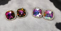 These are definitely an every day go to earring for me! The left pair has more of a green iridescent to it while the other pair is an AB iridescent. Both are GORGEOUS and I get compliments EVERY time I wear them! Both are outlined in gold