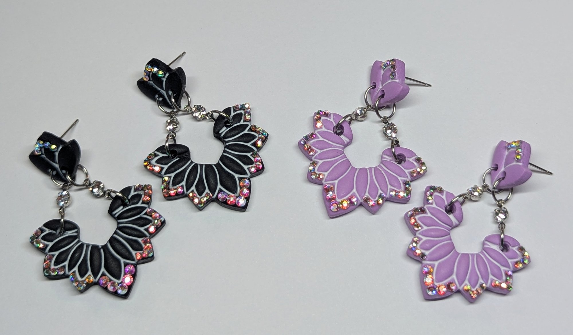 These are made by me out of clay and are SO BOUGIE! They are VERY lightweight and have glass AB rhinestones. The studs have stainless steel posts and the backs of each piece are sealed with a UV resin for extra durability.